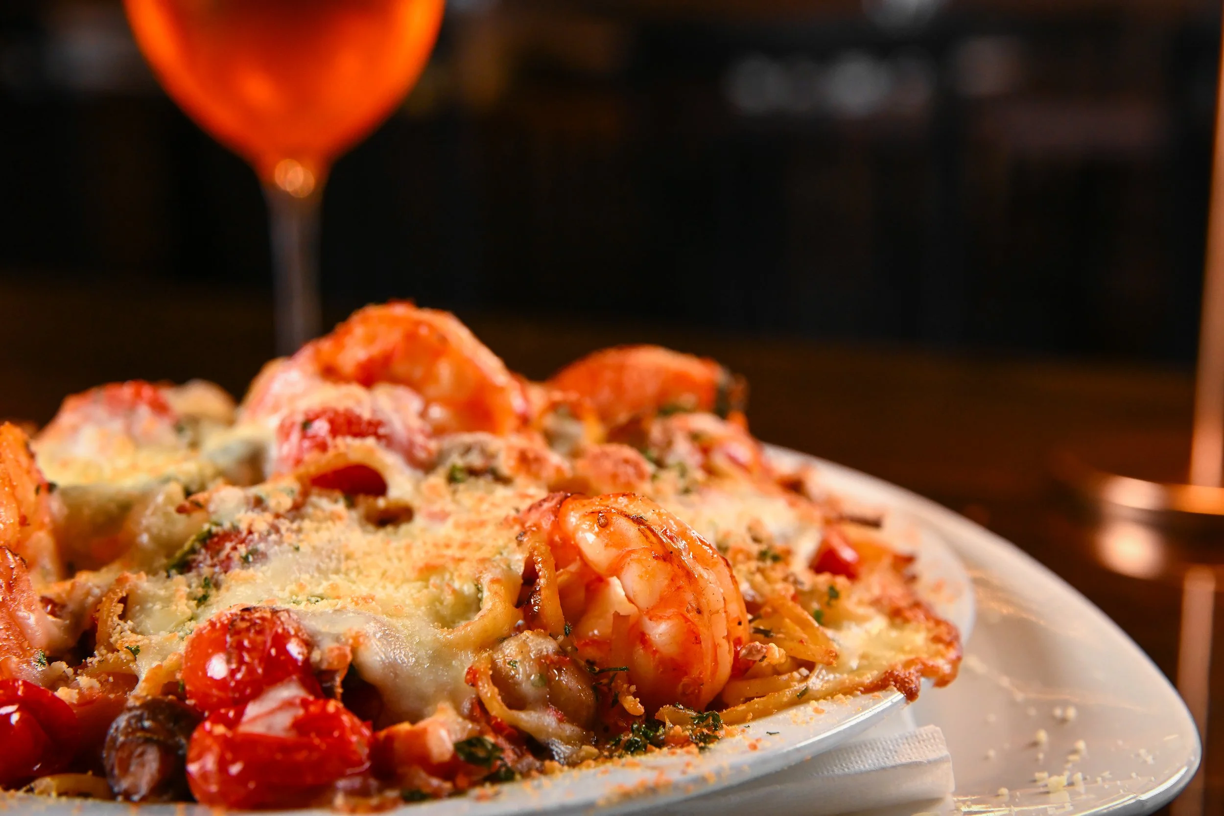Kick it up a notch and enjoy a spicy combination of Gulf shrimp, mushrooms, chili garlic, onions, baby spinach and fresh diced tomatoes sauteed in our Calabrese sauce. Baked in the oven with mozzarella cheese.
